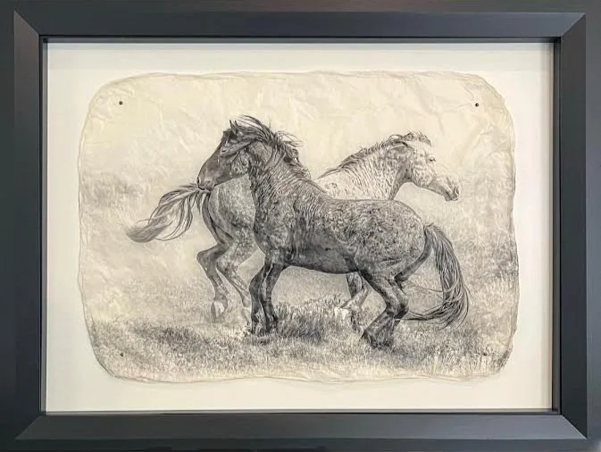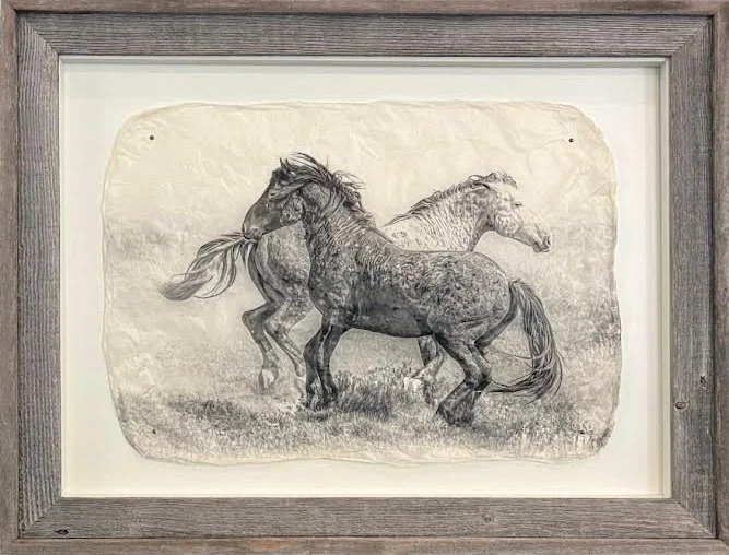 These two beautiful mustangs were photographed in the Onaqui HMA in Utah. They circled around each other multiple times as if they were dancing. This Limited edition piece is available in both Black and Barnwood Frames. It is also available in two different sizes, (all sizes are approximate) 20”x26” and 30”x40”.